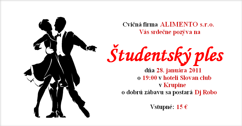 Študenti cvičnej firmy už 12. rok organizujú reprezentačný ples Obchodnej akadémie a Gymnázia v Krupine. Tohto ročný študentský ples, ktorý sa konal v sobotu dňa 28. 1. 2012 zorganizovala cvičná firma Alimento s. r. o., v priestoroch Slovan clubu.